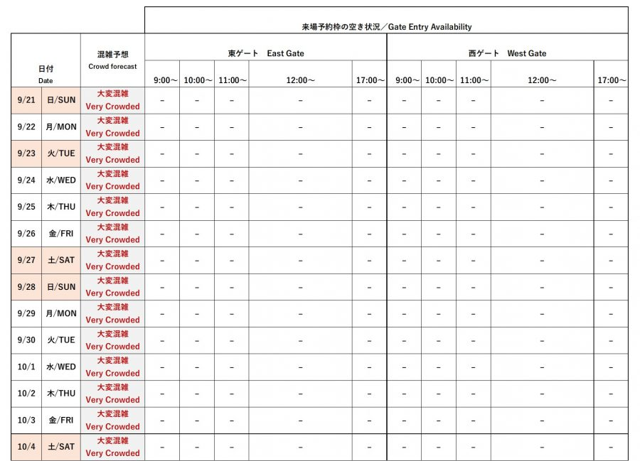 既にほとんどの日程で東ゲート西ゲートともに11:00までの入場定員は満員になっているようです。