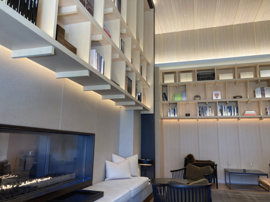館内には、アートギャラリーのような廊下や、中庭を望むライブラリーがあり、どこを切り取っても絵になる空間です。