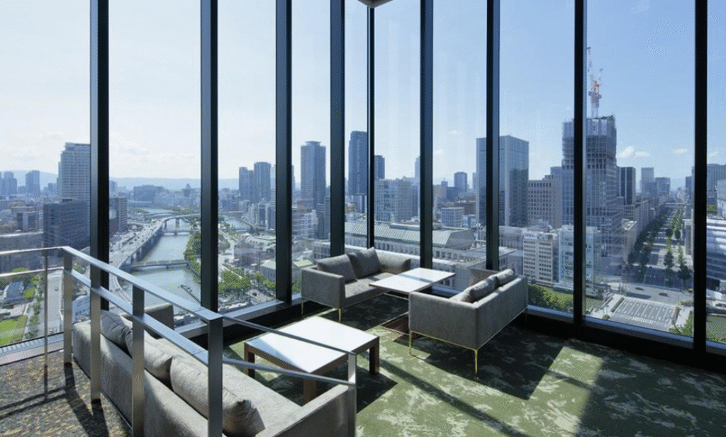 客室の奥側には御堂筋が一望できる大開口の窓が設置されています。