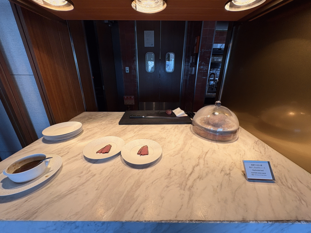 ホテルのライブキッチンで提供され、ジューシーな牛肉と香ばしいソースが最高です。