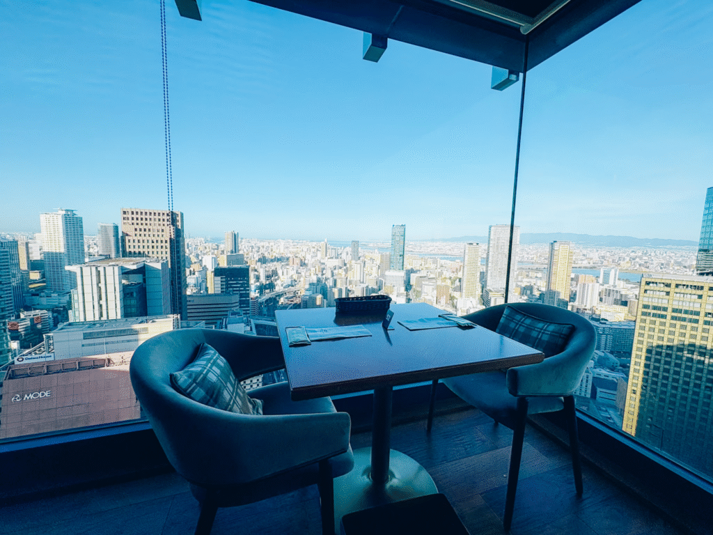 大きな窓からは大阪駅周辺の都会のパノラマビューが一望でき、