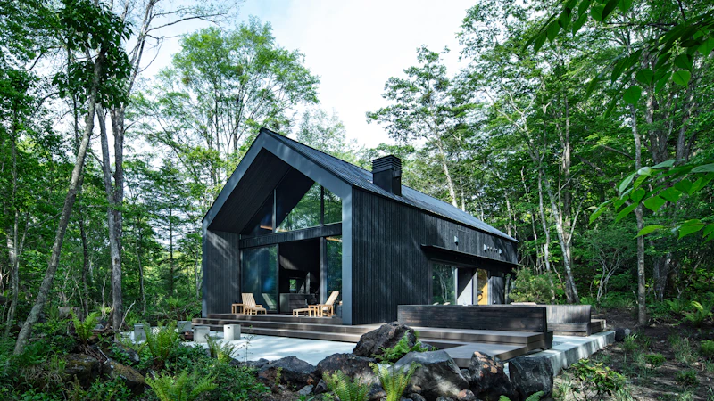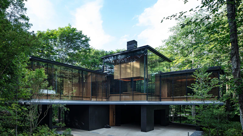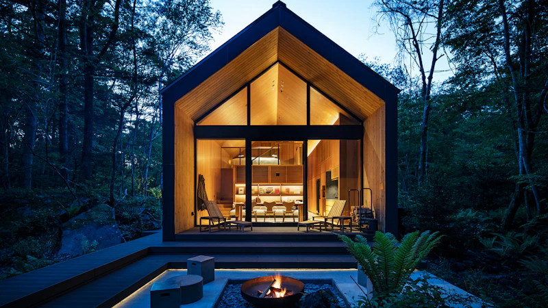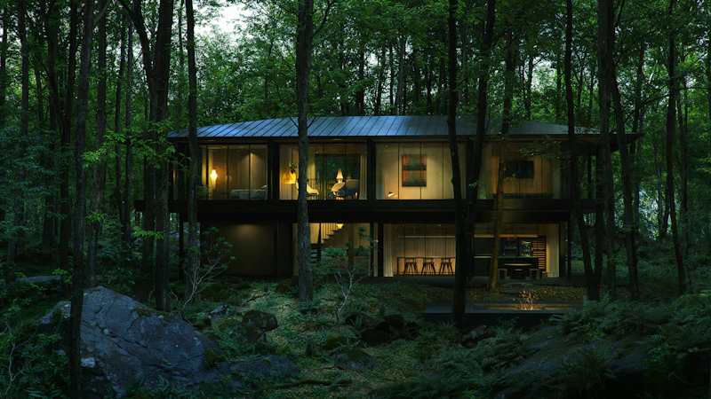 群馬県北軽井沢の森の中に建つ、アイコニックなガラス張りの建築。リビング中央に配置された「囲炉裏」を囲み、360度の森林ビューを楽しめる、最大8名宿泊可能なモデルです。