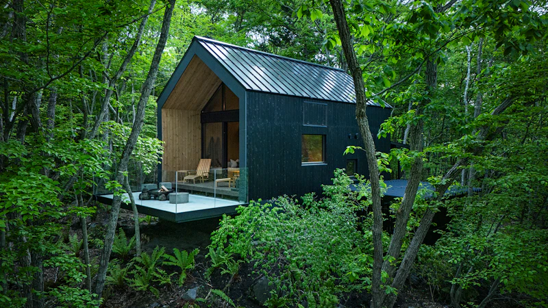 北軽井沢の三角屋根ヴィラ(Sサイズ)。ソロ利用やペア利用に特化したコンパクトな設計で、秘密基地のように森の自然を身近に感じられます。