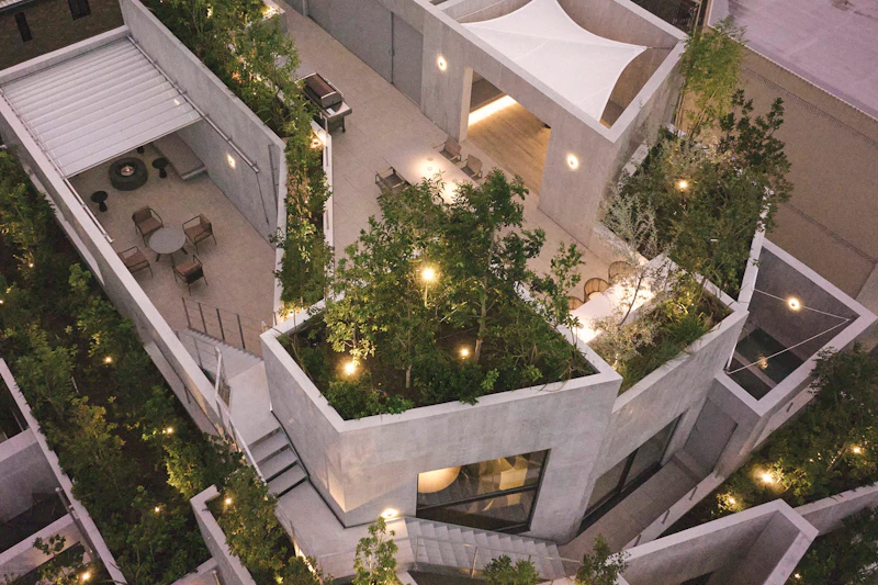 福岡市薬院にある都市型ホテルの最上階・ルーフトップ付きペントハウス。100平米超のテラスにジェットバスやサウナを備え、都心にいながら空を感じられる贅沢な空間です。