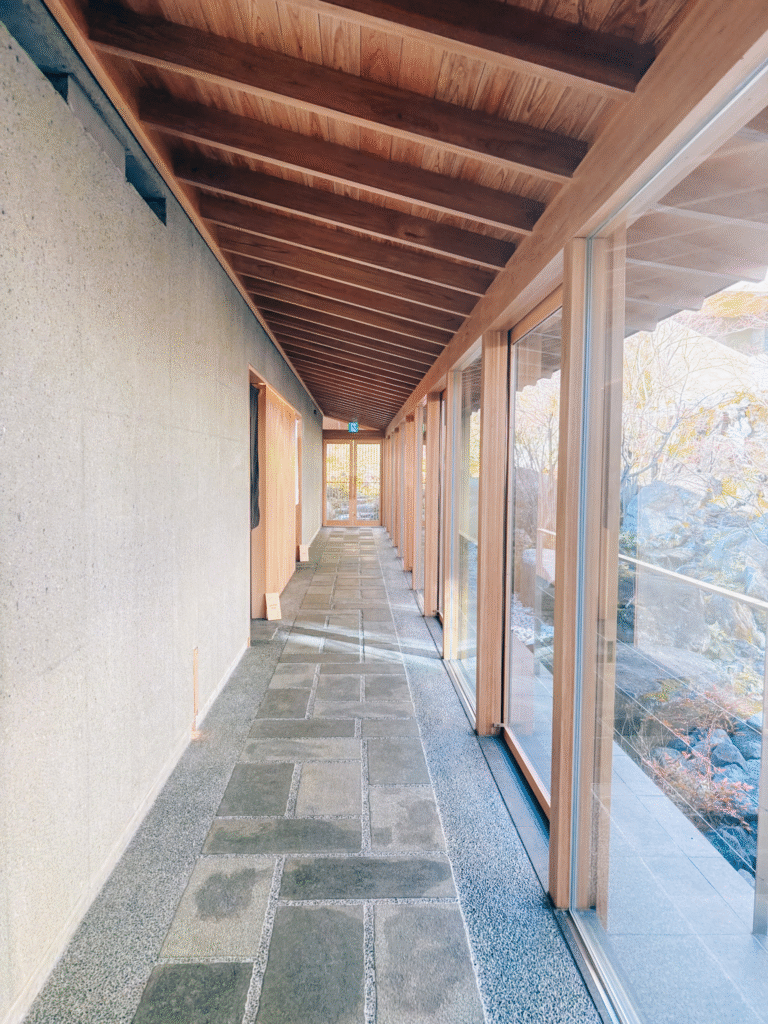 和菓子をいただき一段落すると館内の案内をしてくださりながらお部屋へ案内してくださいます。