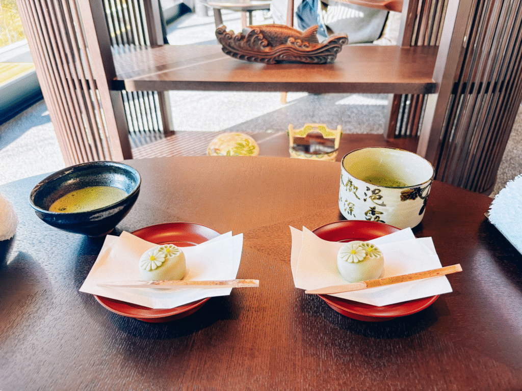 ロビーに到着すると早速お茶菓子とお抹茶を提供してくださいます。