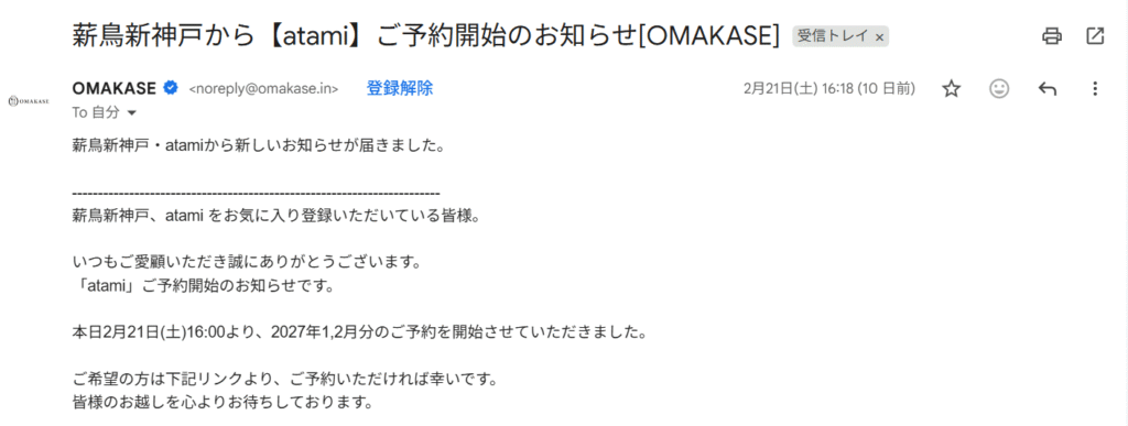 OMAKASEでatamiのお気に入り登録をしておくことで、予約枠が開放された際に通知を受け取ることが可能です。