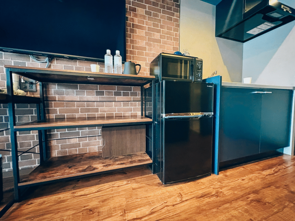 IH1口キッチン、電子レンジ、冷蔵庫が完備されています。これは連泊・長期滞在に刺さる装備です。宮古島のスーパーやコンビニで買い込んで部屋食にすることもできるし、泡盛を冷やして飲むこともでき、旅行の自由度が上がります。