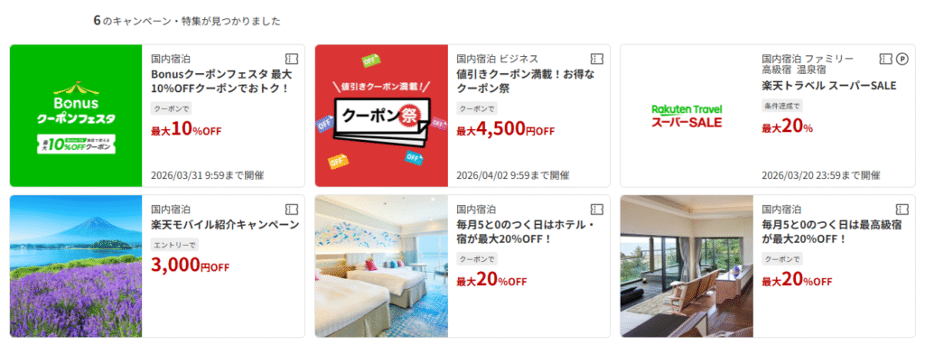 - 「5と0のつく日」が強力: 毎月5、10、15、20、25、30日に開催されるキャンペーンでは、ホテル・温泉宿が最大20%OFFになるクーポンが配布されます。