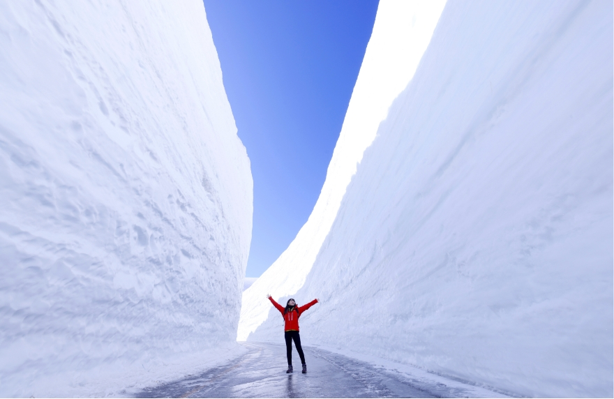 特別に歩行者が入れる「雪の大谷ウォーク」(5月中旬まで開催)では、巨大な雪壁の中を歩くことができます。雪の中から桜や高山植物が顔を出し、春と冬が同時に存在する不思議な光景は日本でここだけ。私が初めてお客様を連れてきたとき、全員が声を上げて驚いていました。
