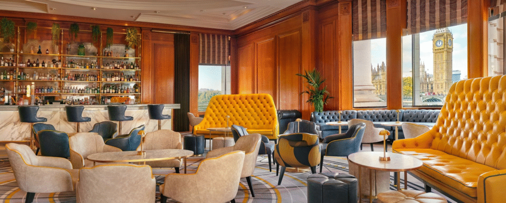 「County Hall Club」は、旧ロンドン市庁舎の重厚な内装をそのまま活かした格調高いラウンジです。石造りの壁・高い天井・クラシックな調度品に囲まれた空間は、近代的なホテルのラウンジとは一線を画します。テムズ川を望む席に座ると、ロンドンアイの回転を眺めながらくつろぐことができます。